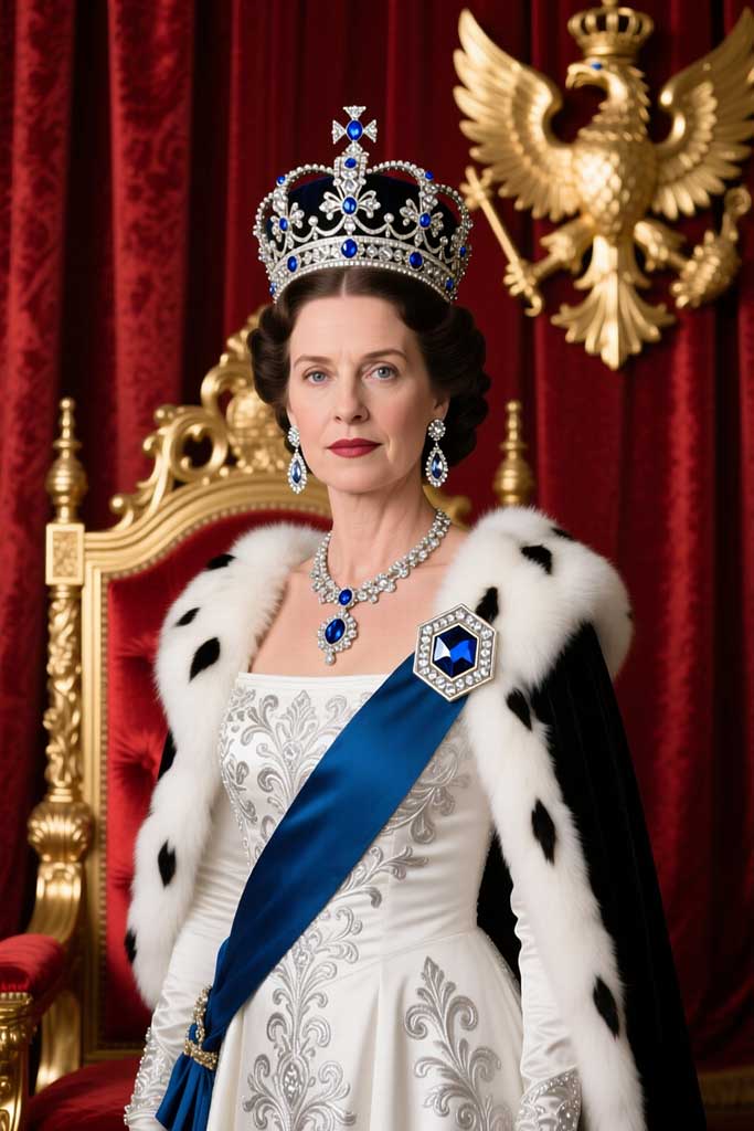 ✨ Exquisite Artisan Details. Features a stunning silver-encrusted crown, luxurious white fur stole, and a magnificent blue sash rendered with lifelike texture.